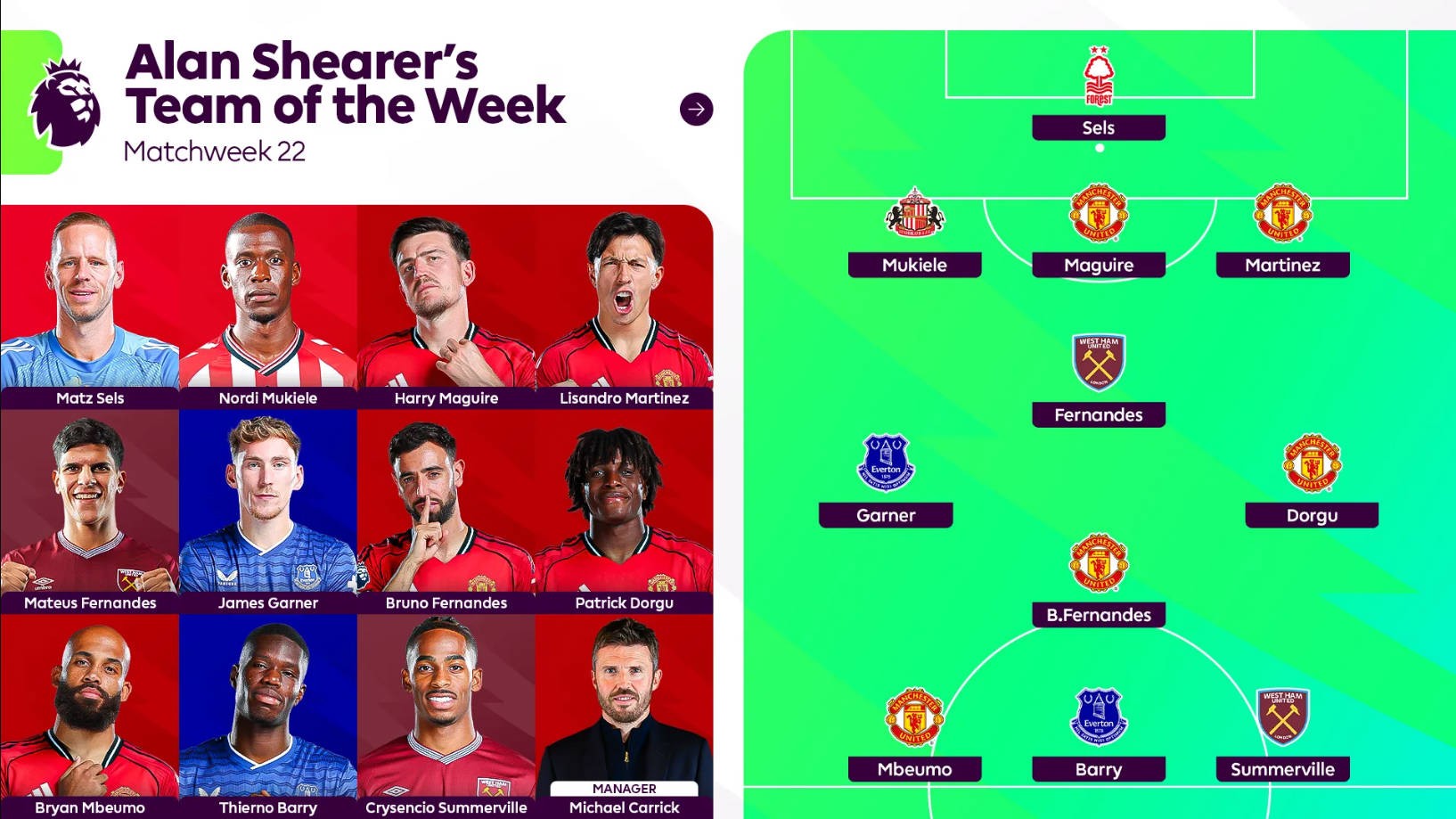 希勒评英超第22轮最佳阵:曼联5人在列,埃弗顿、西汉姆各2人